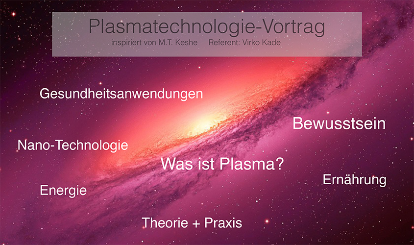 Plasmatechnologie ist die Verbindung zwischen neuer Physik und Spiritualität. Der Begriff „moderne Alchemie“ passt genauso. Der Schwerpunkt liegt auf den Nutzungsmöglichkeiten für unseren Alltag, wie Gesundheit, Nahrung, Landwirtschaft, Energie… Dahinter steht die Vision, die Grundprobleme unserer heutigen Kultur zum Wohle des Ganzen zu lösen und ein tieferes Verständnis für unser Leben und unsere Realitätsgestaltung zu erlangen. Viele Inhalte des Vortrages gehen auf die Forschungen des im Iran geborenen Nuklearingenieurs Dr. Keshe zurück, der Menschen anregen will, selbst zu Forschern zu werden.